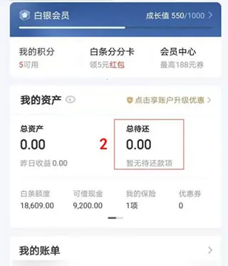 1、进入京东金条贷款App之后,先点击“我的”,再点击“总待还”的红色方框区域。