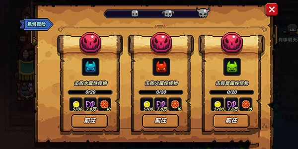 1、悬赏任务是玩家每天必须完成的几项活动之一,因为它能直接奖励玩家大量的经验以及金币,从而实现快速升级。冒险任务分为三环,每环包括3个消灭特定属性怪物的任务以及1个通关特定关卡的boss任务,环数越高,奖励的金币以及经验越丰厚,但完成难度也就越高。